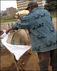 Water trader Simon Kamau, who uses donkeys to transport water to his clients, says, “The problem is that the donkey can give you a fatal kick.