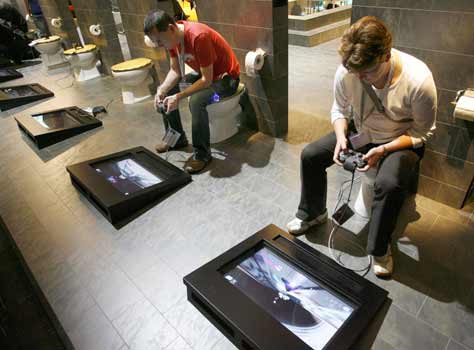 Visitors sit on toilet seats to play with Playstation 3 at an exhibition stand of Japanese Sony Company at the Games Convention 2007 fair in east Germany. The Games convention, Europe’s leading fair for computer games, runs from August 22 to 26.