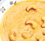 Heat four tbsps ghee and roast moong dal lightly. Pressure-cook with milk for two whistles or till soft.